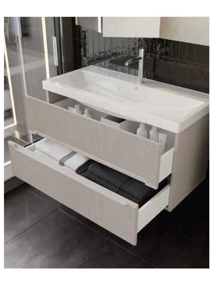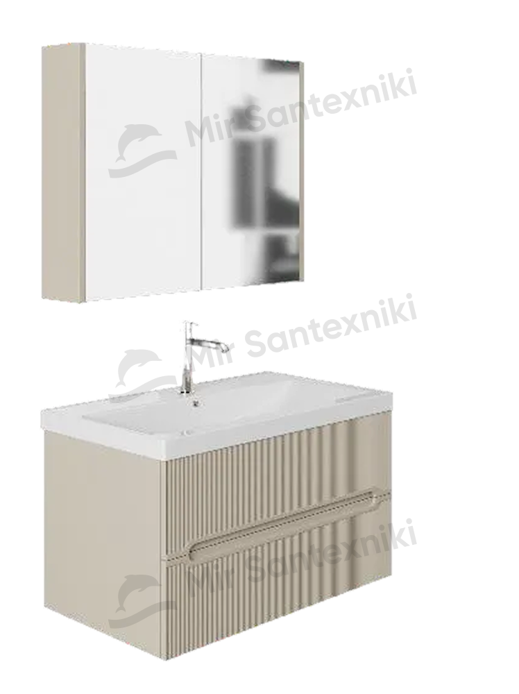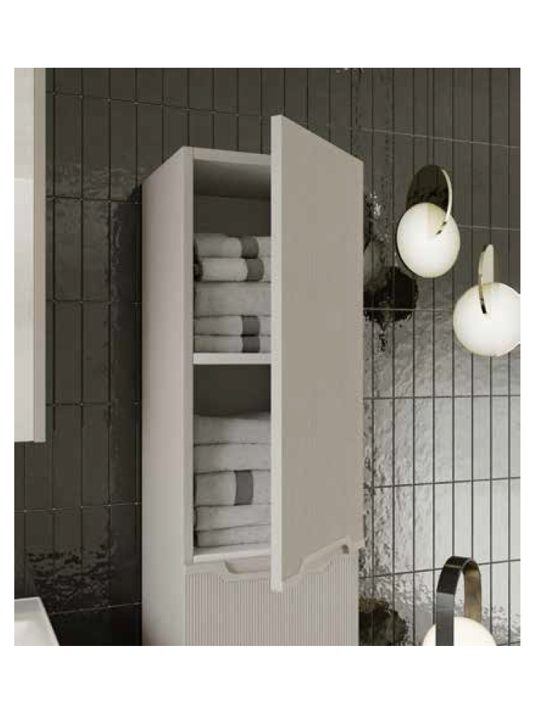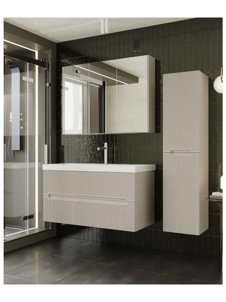 Комплект мебели для ванной Bella в цвете кашемир выглядит спокойным и премиальным. Матовые поверхности, рифлёная текстура фасада и интегрированные ручки создают чёткий, лаконичный облик без видимой фурнитуры. Корпус и фасад выполнены в едином кашемировом цвете, а МДФ обеспечивает стабильность формы. Подвесная зона умывальника шириной 60, 80 и 100 см легко вписывается в ванные комнаты разных размеров и формирует упорядоченный центр с современным и дружелюбным характером.