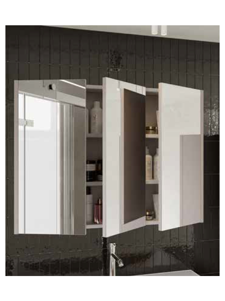 Зеркальный шкаф демонстрирует надёжность благодаря продуманной внутренней организации и коротким расстояниям между функциональными зонами. Полки расположены в зоне лёгкого доступа, а зеркальная поверхность без разрывов продолжает спокойную линию фасада. В сочетании с тумбой под умывальник зеркальный шкаф формирует чёткий визуальный ориентир в верхней части, подчёркивает порядок и деликатно подхватывает выразительную рифлёную структуру, не нарушая сдержанный общий облик.